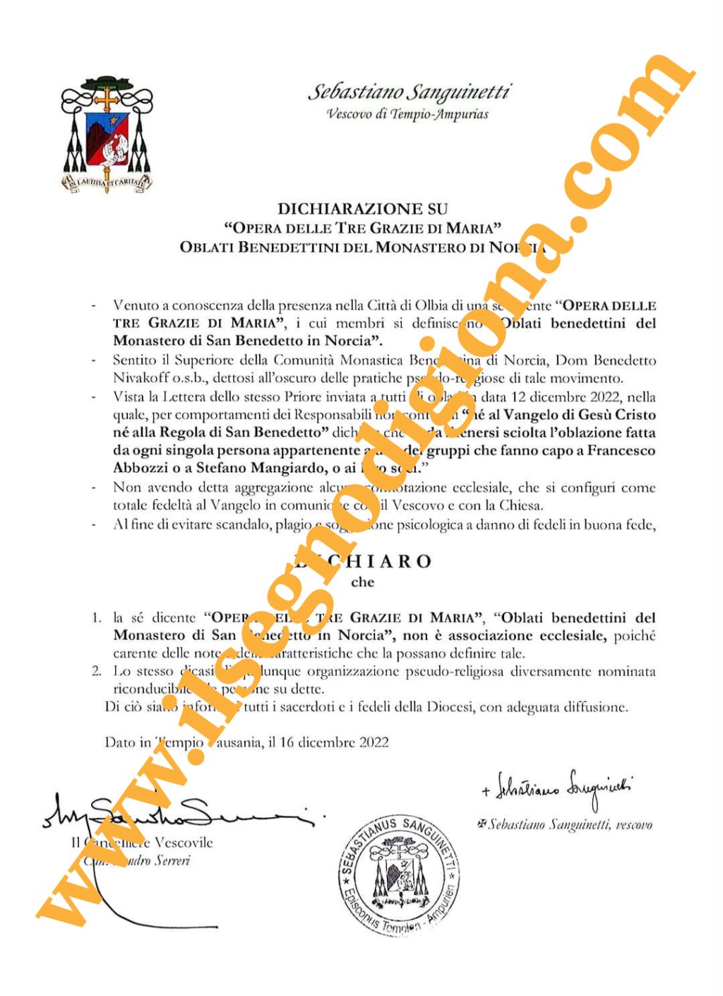 Ecco cosa recita il provvedimento canonico: “Venuto a conoscenza della presenza nella città di Olbia di una sedicente ‘Opera delle Tre Grazie di Maria’ i cui membri si definiscono ‘Oblati benedettini del Monastero di San Benedetto in Norcia’, dopo aver “sentito il Superiore della Comunità Monastica Benodettina di Norcia, dom Benedetto Nivakoff o.s.b., dettosi all’oscuro delle pratiche pseudo-religiose di tale movimento e non avendo detta aggregazione “alcuna connotazione ecclesiale, che si configuri come totale fedeltà al Vangelo in comunione con il Vescovo e con la Chiesa” e al fine “di evitare scandalo, plagio e soggezione psicologica a danno di fedeli in buona fede” “dichiaro che la sedicente ‘Opera delle Tre Grazie di Maria Oblati benedettini del Monastero di San Benedetto in Norcia’ non è associazione ecclesiale, poiché carente delle note e delle caratteristiche che la possano definire tale”.