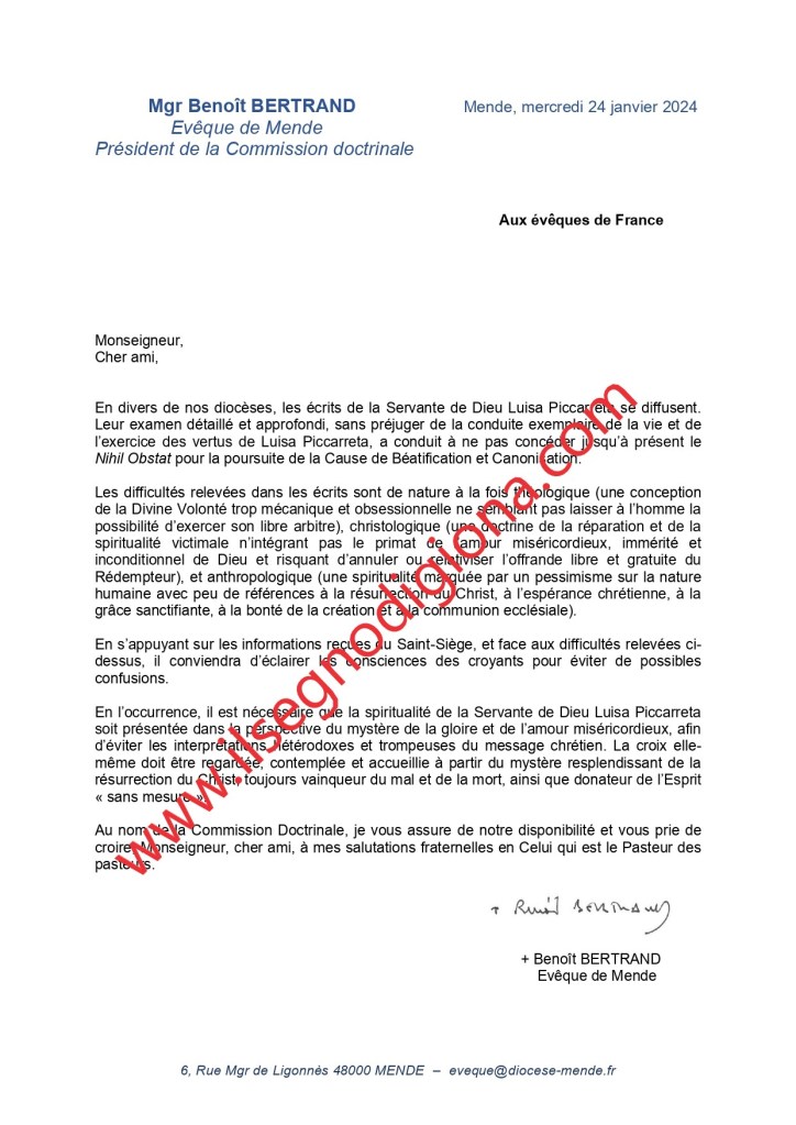 Dopo la dura presa di posizione di un vescovo (VEDI QUI) di una importante diocesi americana, contro gli scritti e la spiritualità della mistica Luisa Piccarreta, ora sono in grado di pubblicare anche un importante documento di un autorevole rappresentante dell’episcopato francese – il vescovo di Mende, mons. Benoît Bertrand, Presidente della Commssione dottrinale della Conferenza Episcopale francese – che in una lettera – datata 24 gennaio 2024 – invita alla prudenza tutti i vescovi francesi sul caso di Luisa Piccarreta.