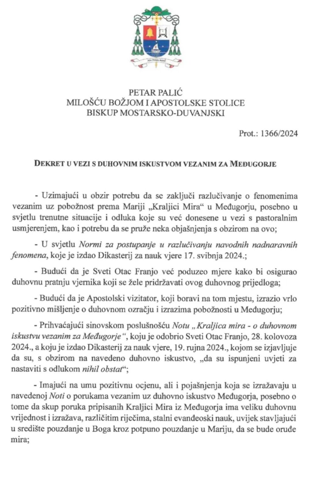 – Accettando con filiale obbedienza la Nota “Regina della Pace – sull’esperienza spirituale relativa a Medjugorje”, approvata dal Santo Padre Francesco il 28 agosto 2024 e emanata dal Dicastero per la Dottrina della Fede il 19 settembre 2024, il quale dichiara che, riguardo alla predetta esperienza spirituale, “ricorrono le condizioni per procedere alla decisione del nulla osta”;