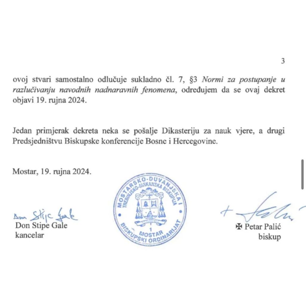 Una copia del decreto dovrà essere inviata al Dicastero per la Dottrina della Fede, l’altra alla Presidenza della Conferenza episcopale della Bosnia ed Erzegovina.