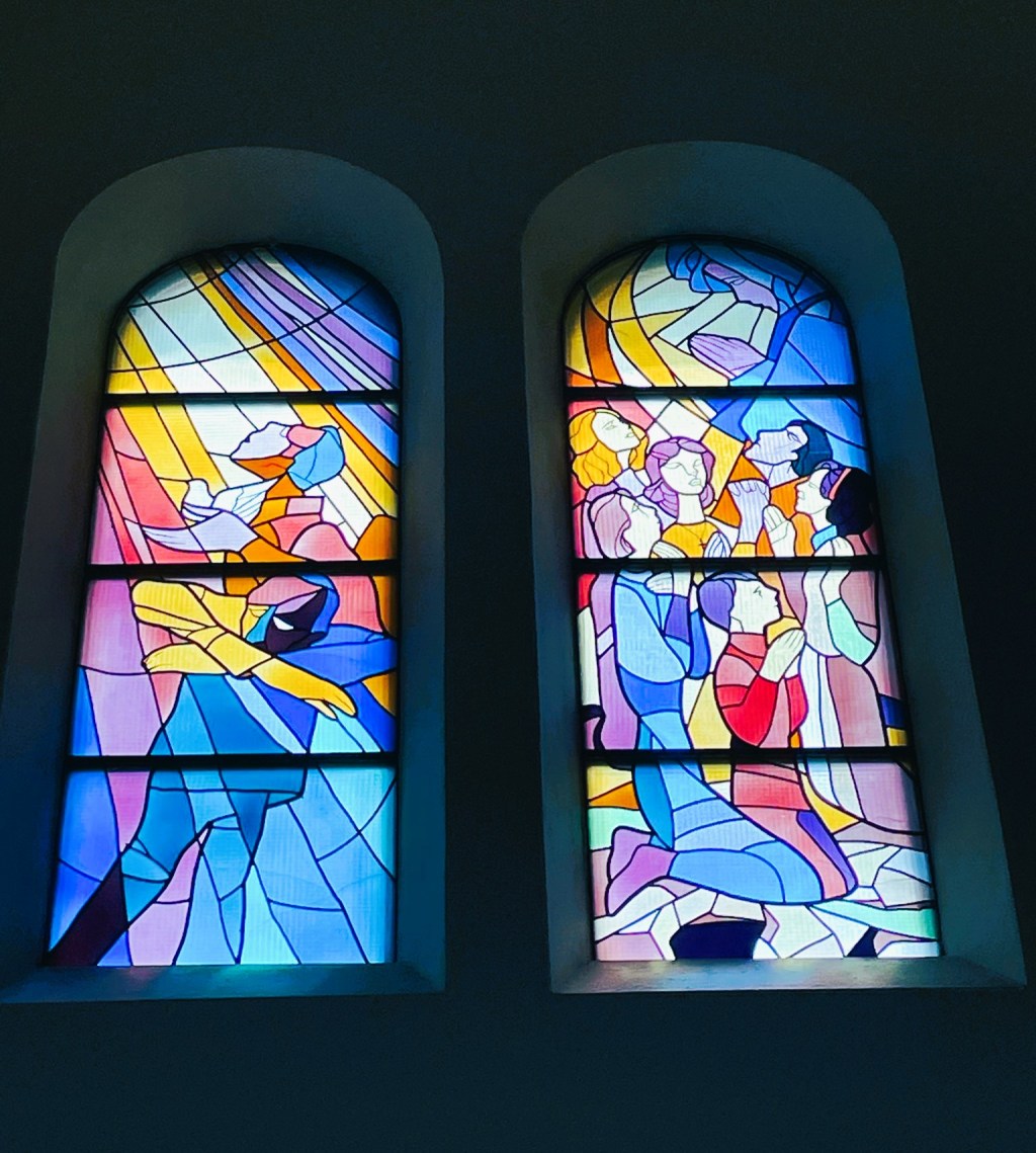 Non vorrei che poi a qualcuno venga in mente di essere ultra zelante e decidesse di abbattere o rimuovere le vetrate che li rappresentano  (VEDI FOTO) – mentre sono in estasi davanti la Madonna –  nella parrocchia di San Giacomo (entrando lato sinistro) a Medjugorje.