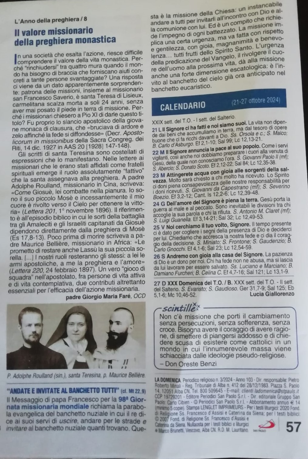 C’è una storia un po’ curiosa che voglio condividere: nel foglietto della messa (Edizione San Paolo) di domenica prossima (20 ottobre) – il classico foglietto che troviamo sui banchi per seguire letture e Vangelo del giorno – viene ospitata una riflessione (o commento) a firma del carmelitano scalzo p. Giorgio Maria Farè. Il titolo del contributo è “Il valore missionario della preghiera monastica” in cui l’autore sottolinea l’efficacia spirituali di tre grandi uomini e donne di chiesa: p. Roulland, santa Terisana di Liseux (a cui personalmente sono molto affezionato) e p. M. Bellière.