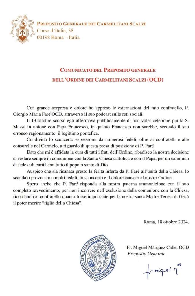 Questa posizione ufficiale del religioso ha provocato “sconcerto” tra i fedeli e costretto  il Preposto Generale dei Carmelitani Scalzi – p. Miguel Màrchez Calle – ad ammonire formalmente  p. Giorgio Maria Farè affinché si ravveda “per non incorrere nell’esclusione dalla Comunione con la Chiesa”.