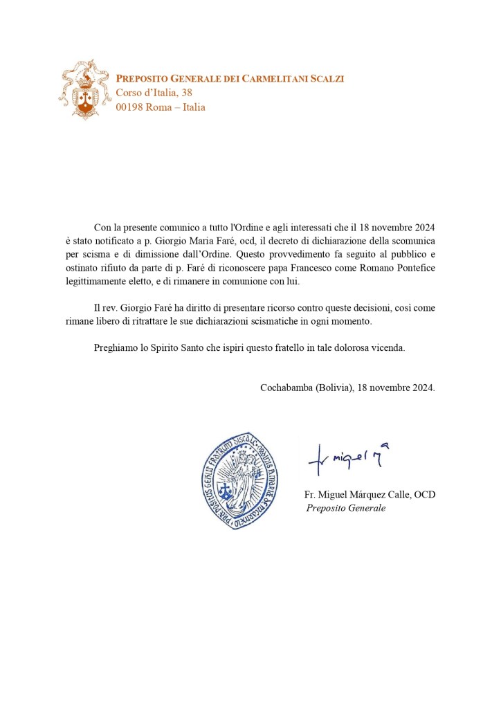 Come era inevitabile, il Preposito Generale dei Carmelitani Scalzi – fra Miguel Marquez Calle – ha comunicato ufficialmente il decreto di dichiarazione di scomunica per scisma e di dimissione dall’Ordine, a Padre Giorgio Maria Faré.